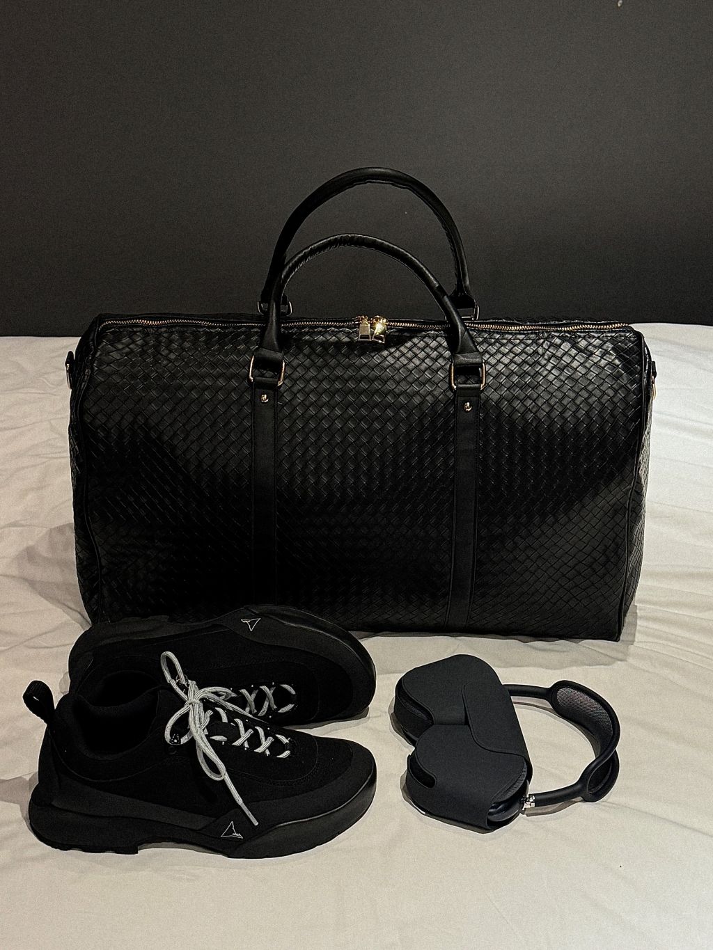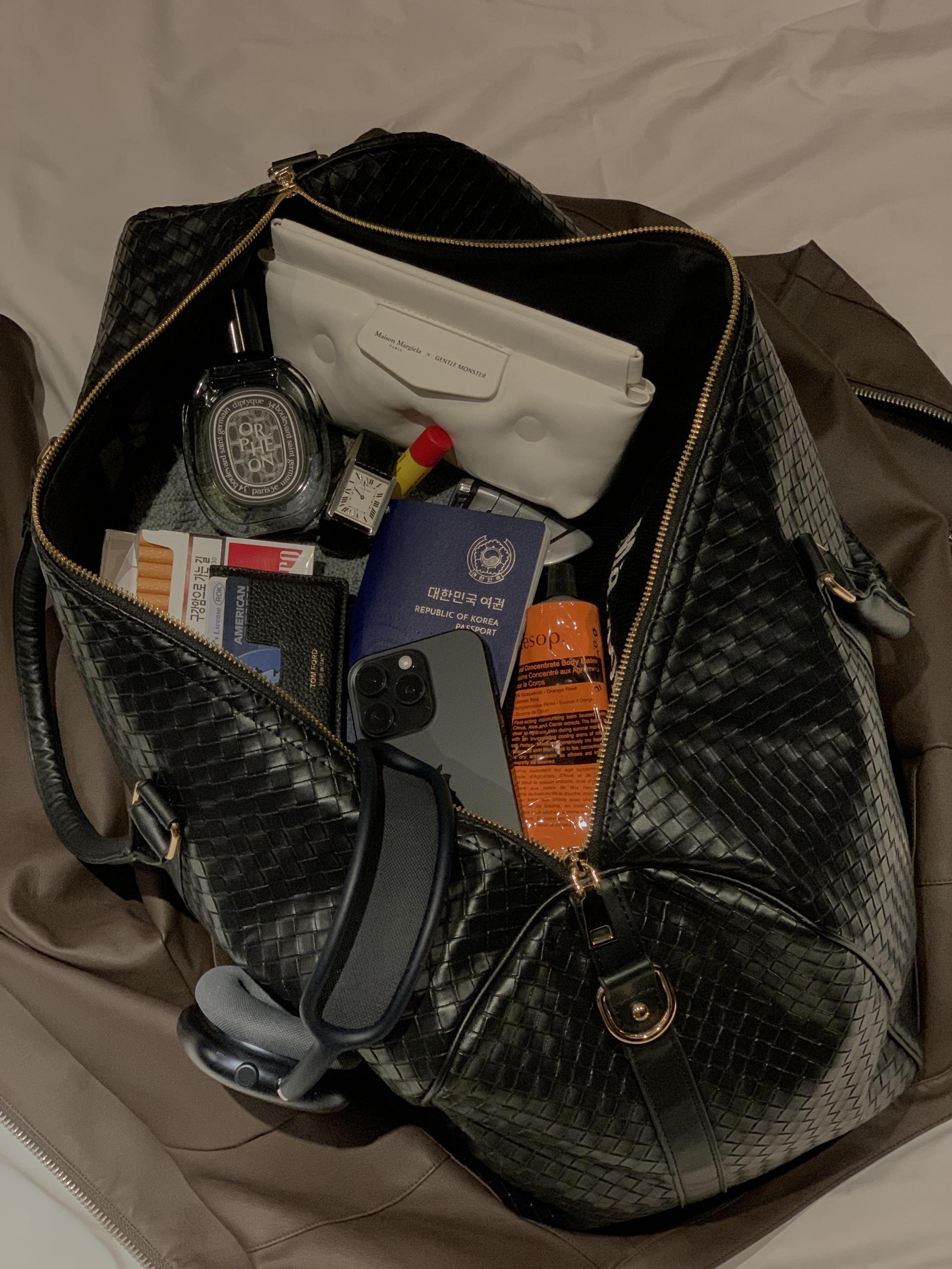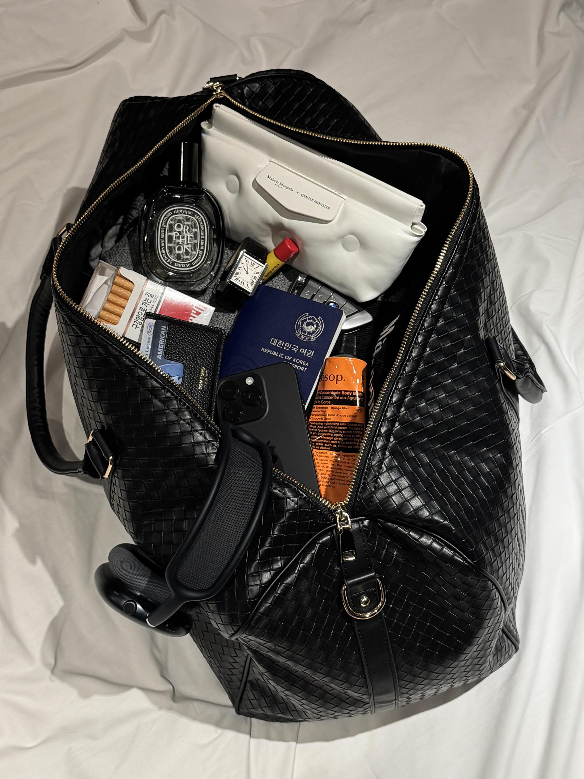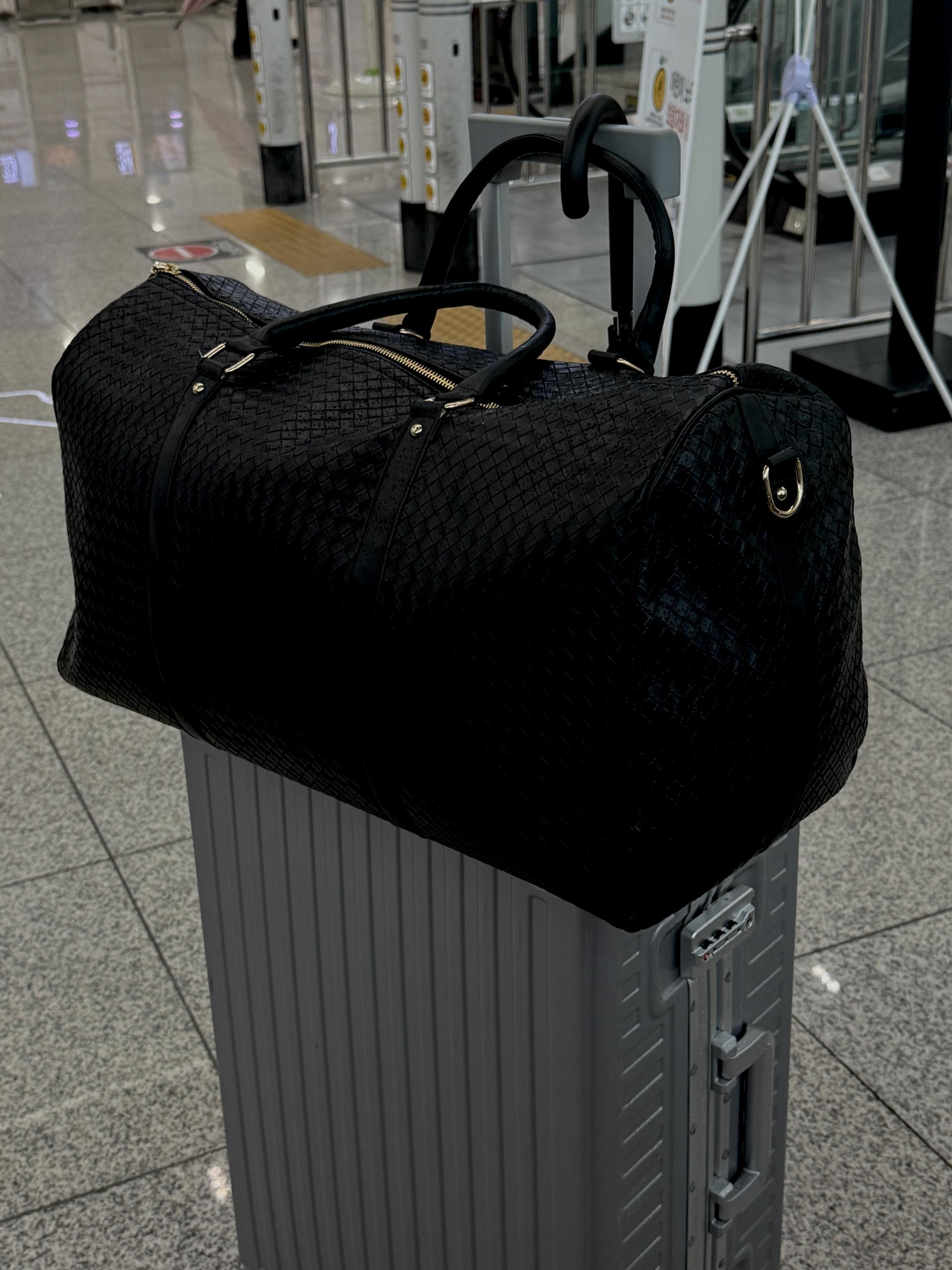 • “은은한 광택의 위빙 텍스처로 세련된 무드를 완성하고, 넉넉한 수납공간으로 다양한 상황에 활용할 수 있는 올블랙 보스턴 백”