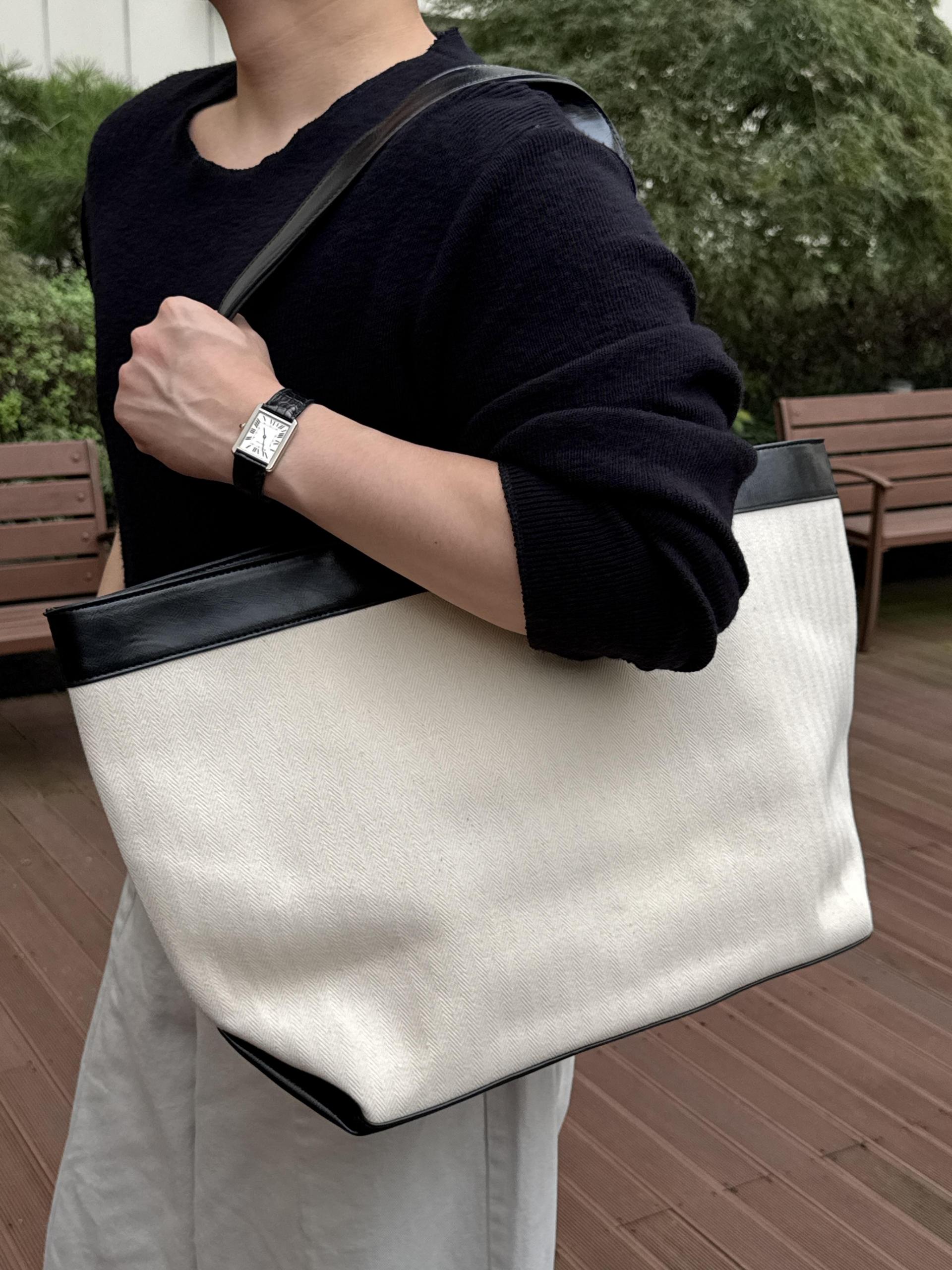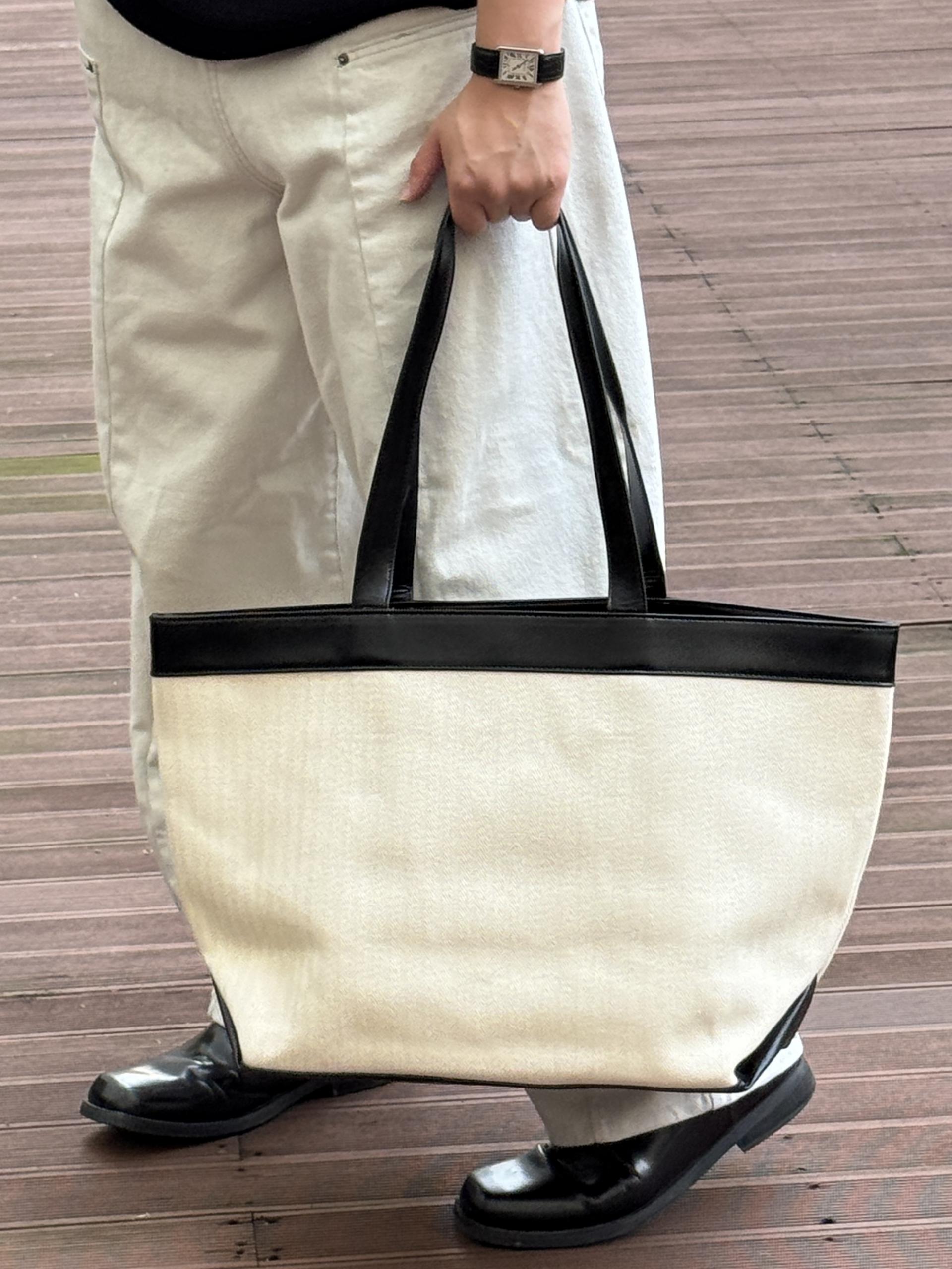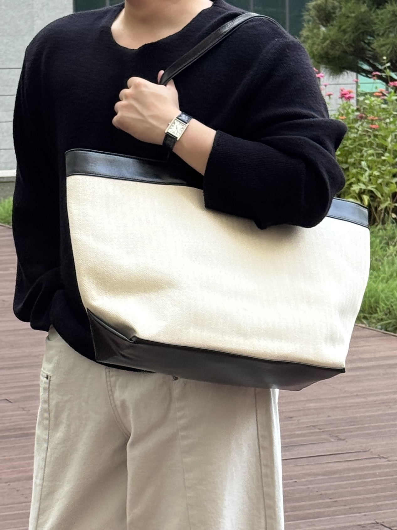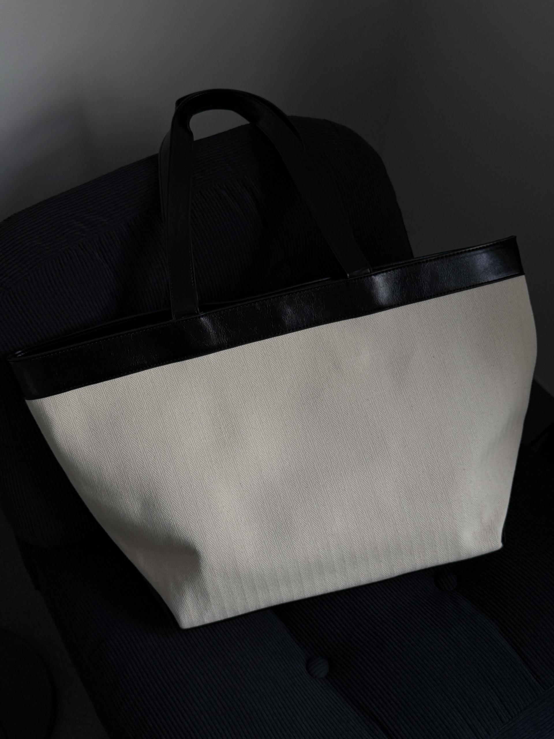 • “면 텍스처의 내추럴한 감성과 투톤 컬러의 조화가 돋보이는 유니섹스 토트백”