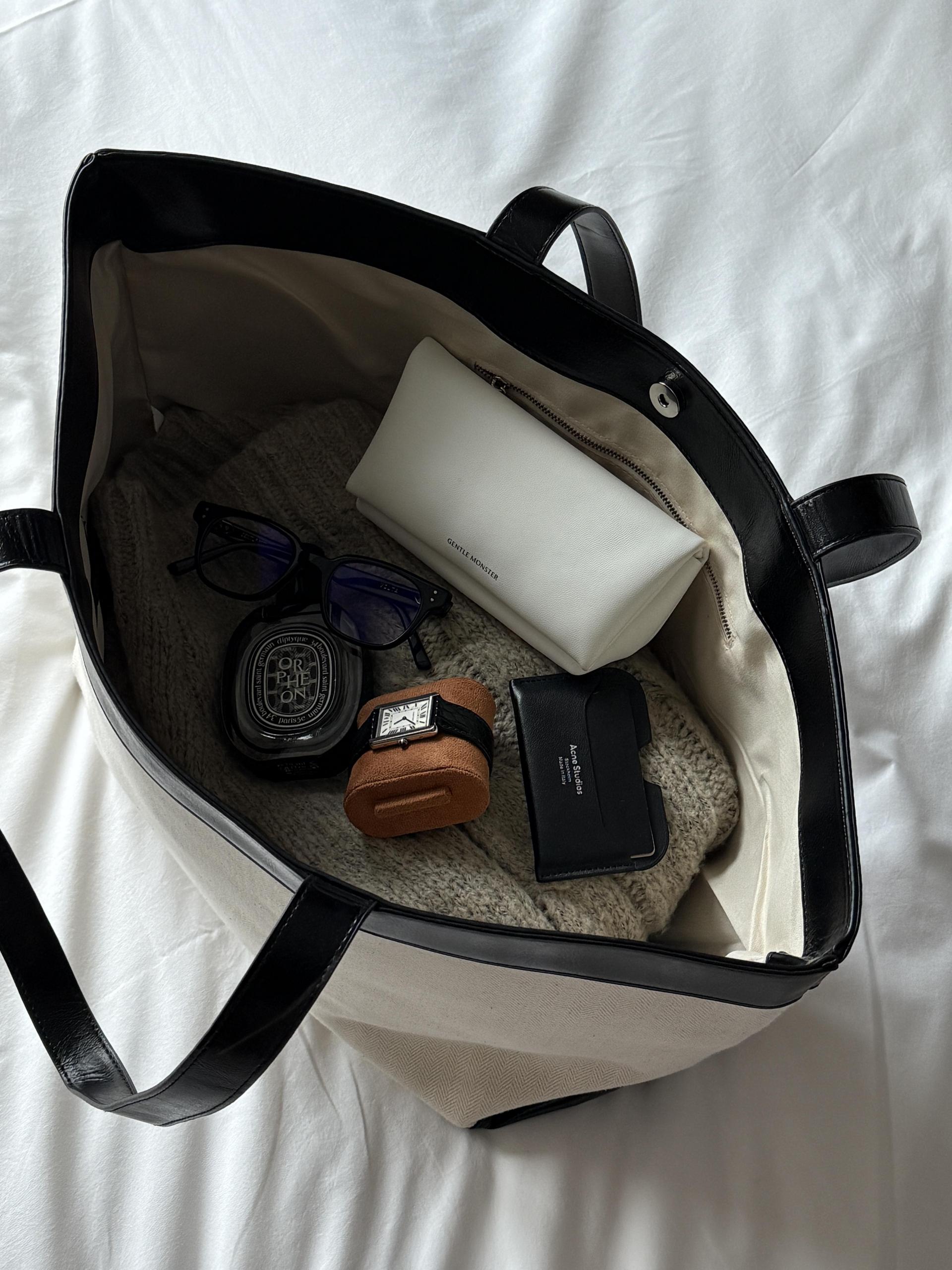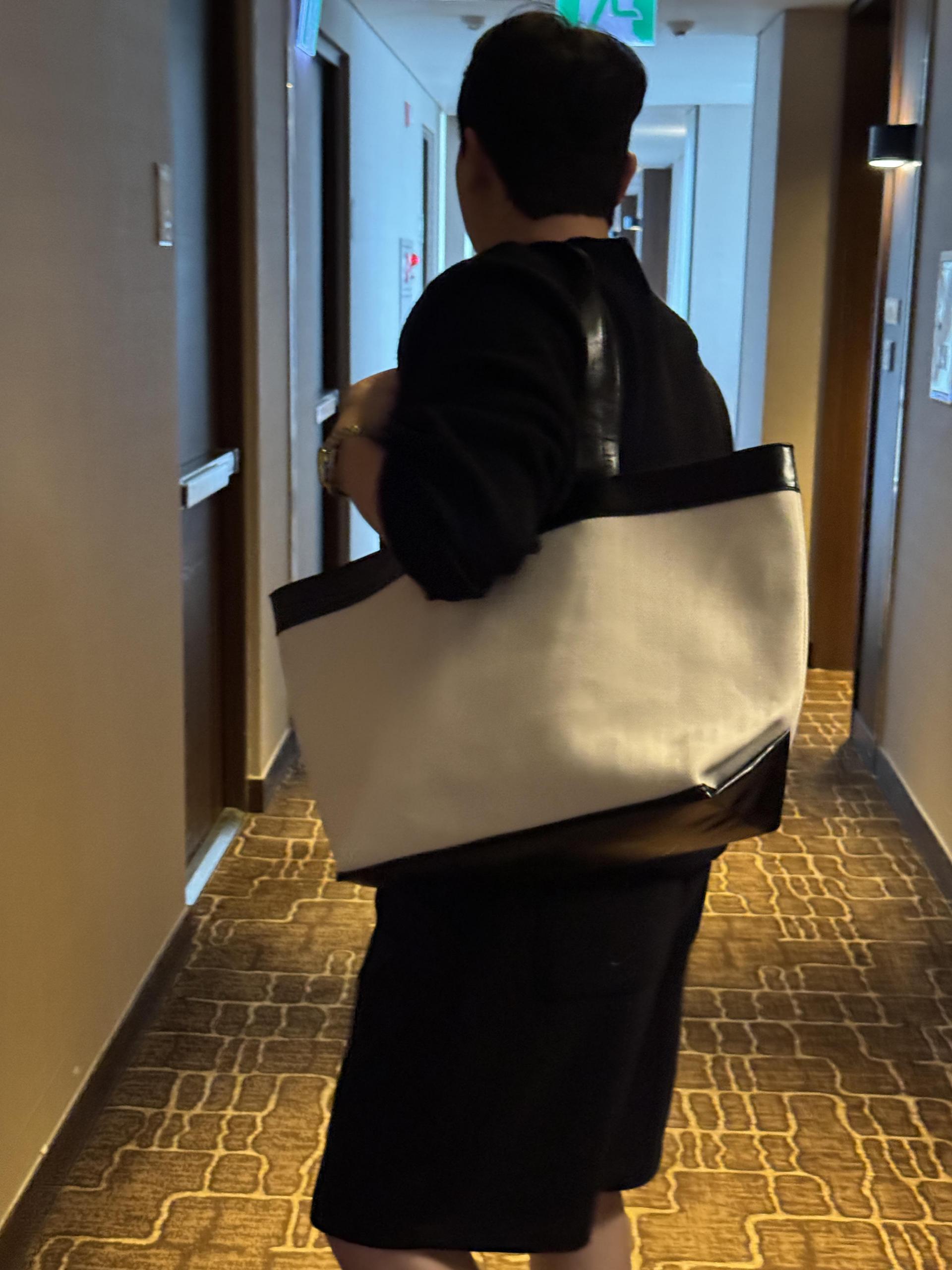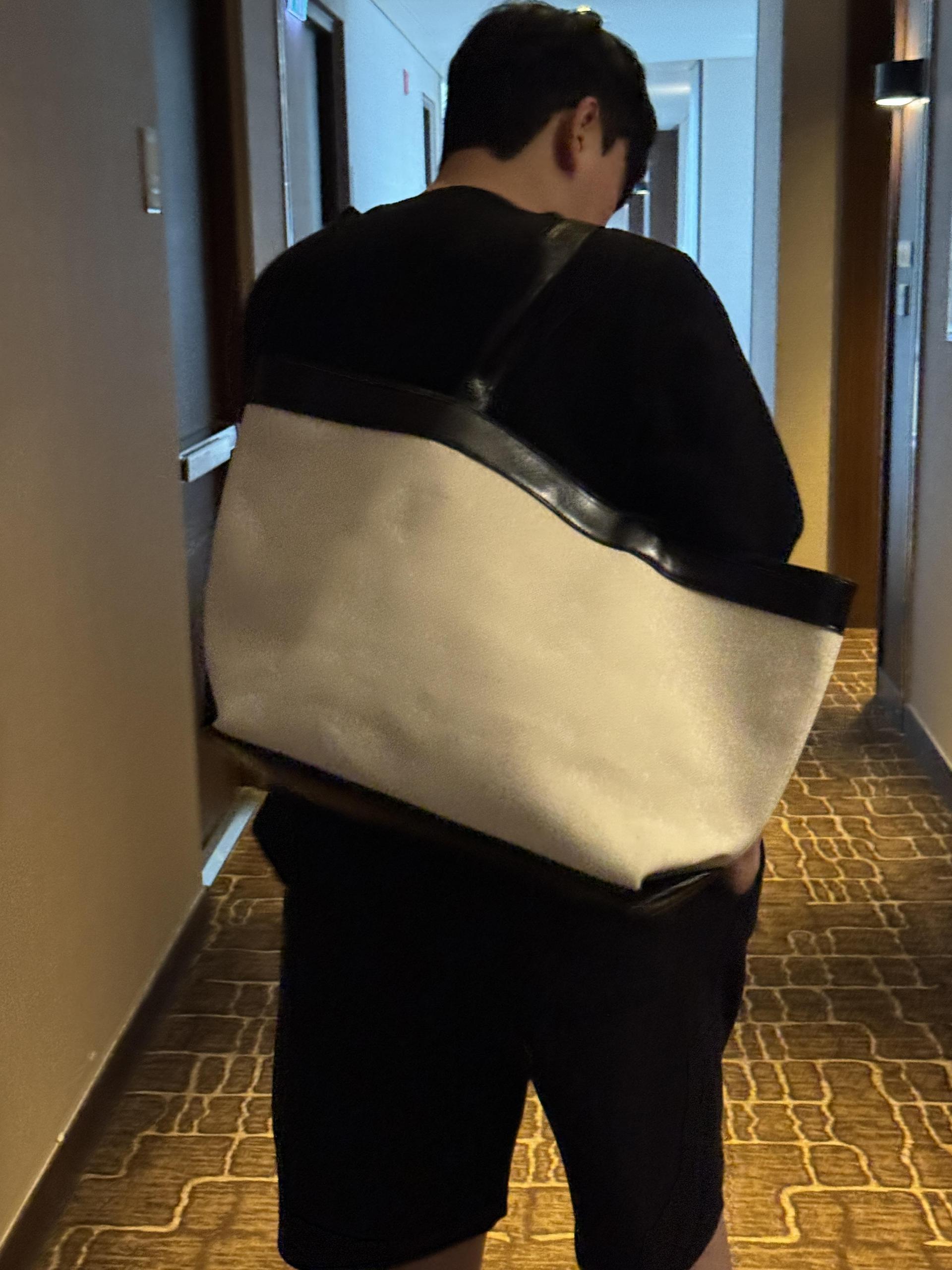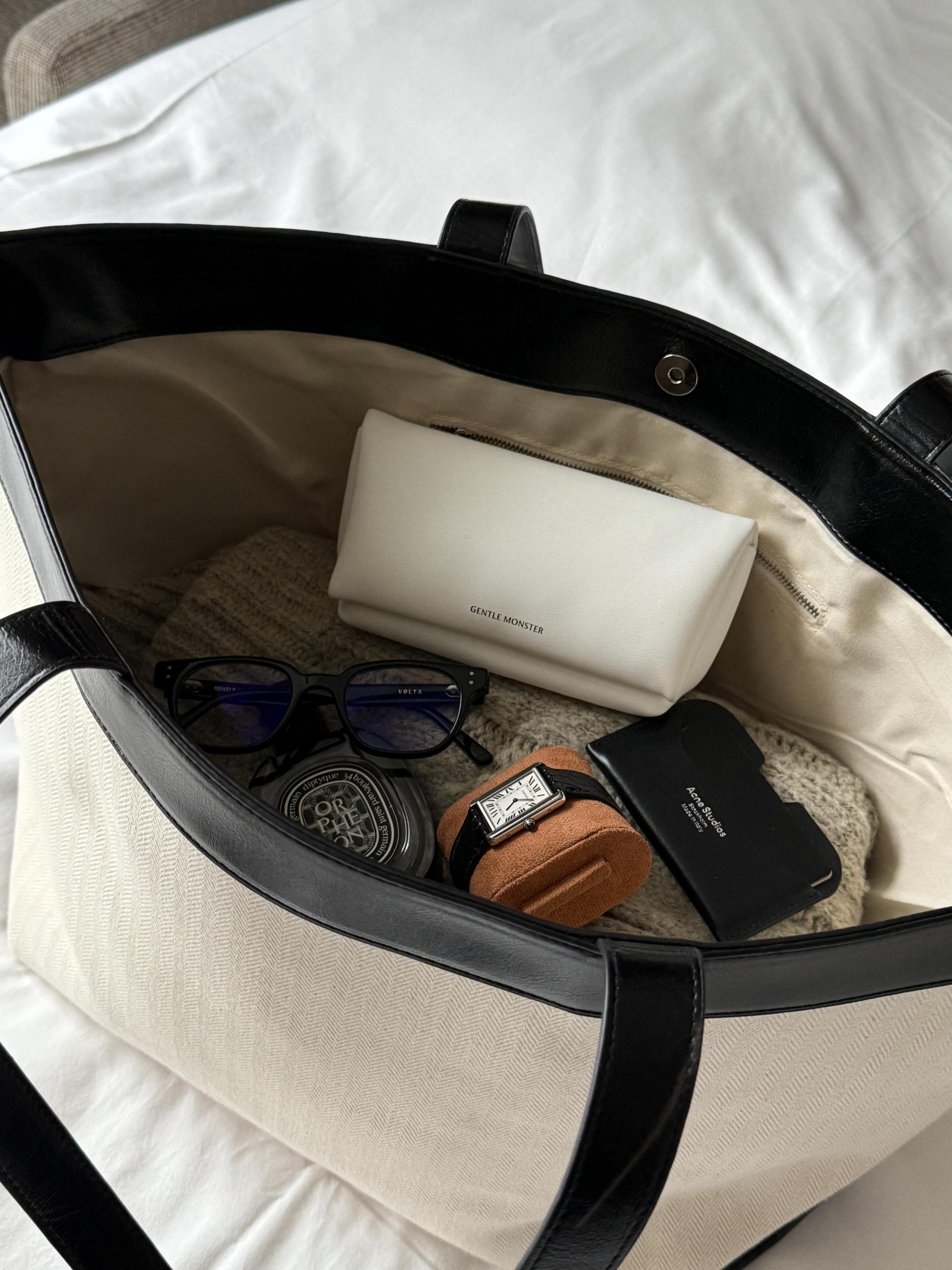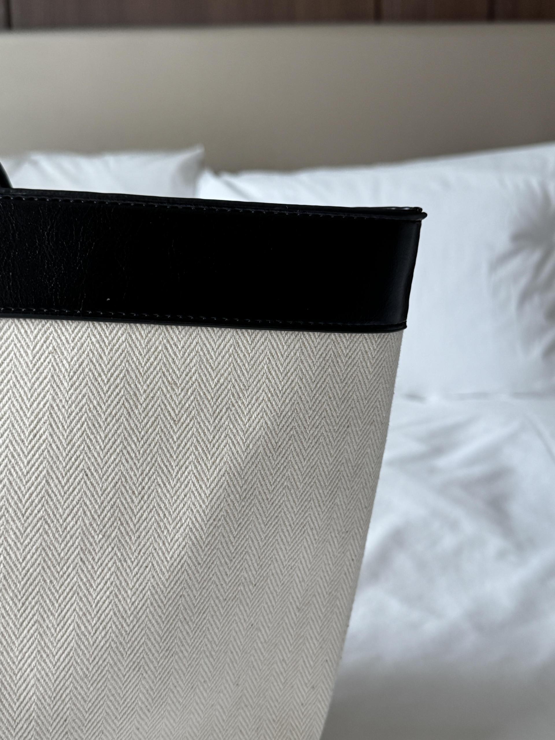 • “면 텍스처의 내추럴한 감성과 투톤 컬러의 조화가 돋보이는 유니섹스 토트백”