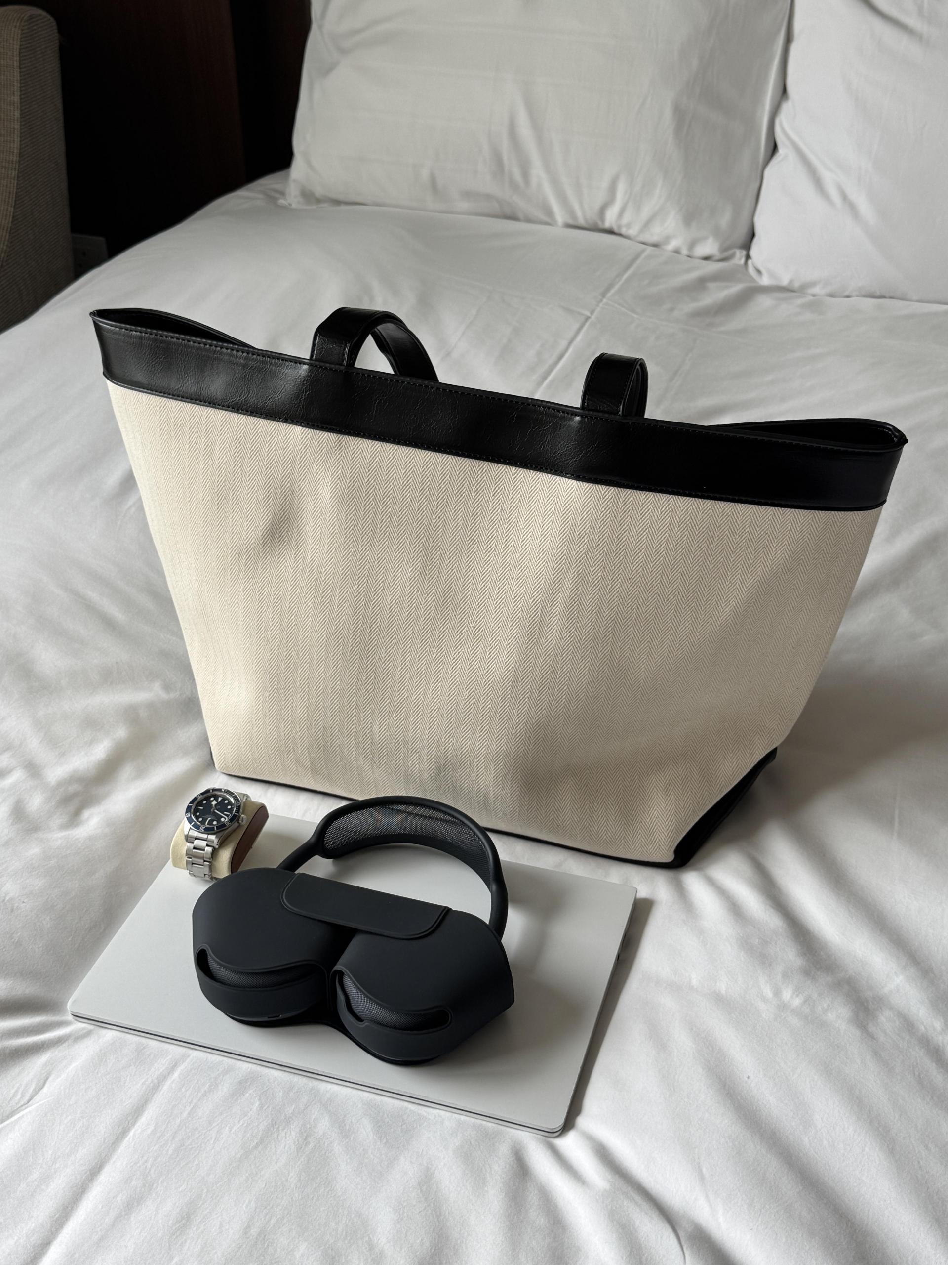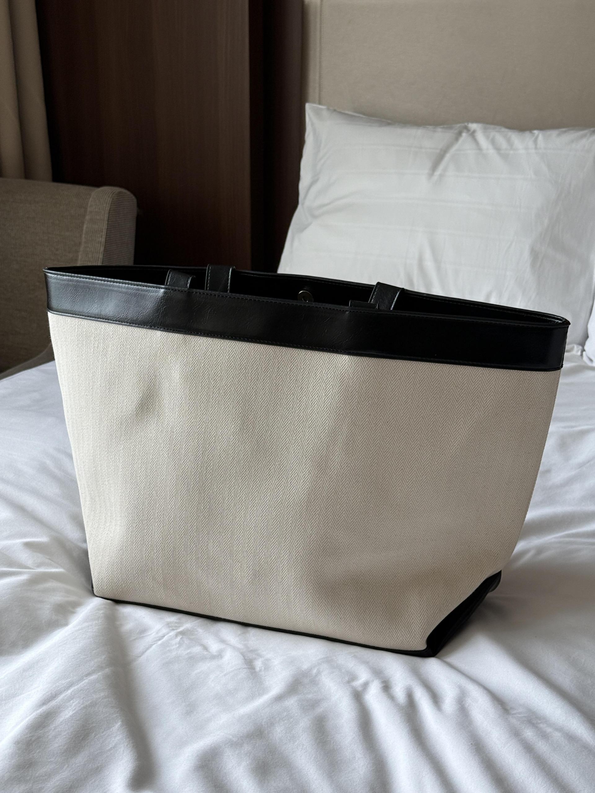 • “캔버스 텍스처의 내추럴한 감성과 투톤 컬러의 조화가 돋보이는 유니섹스 토트백. 노트북 수납도 가능한 실용적인 디자인.”