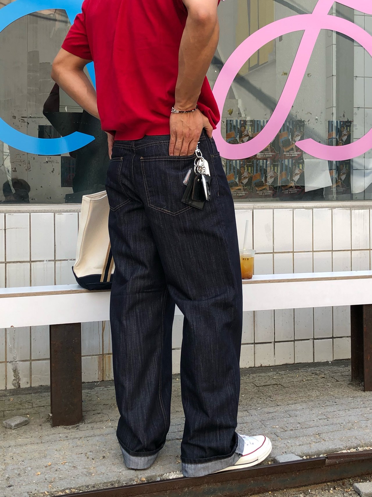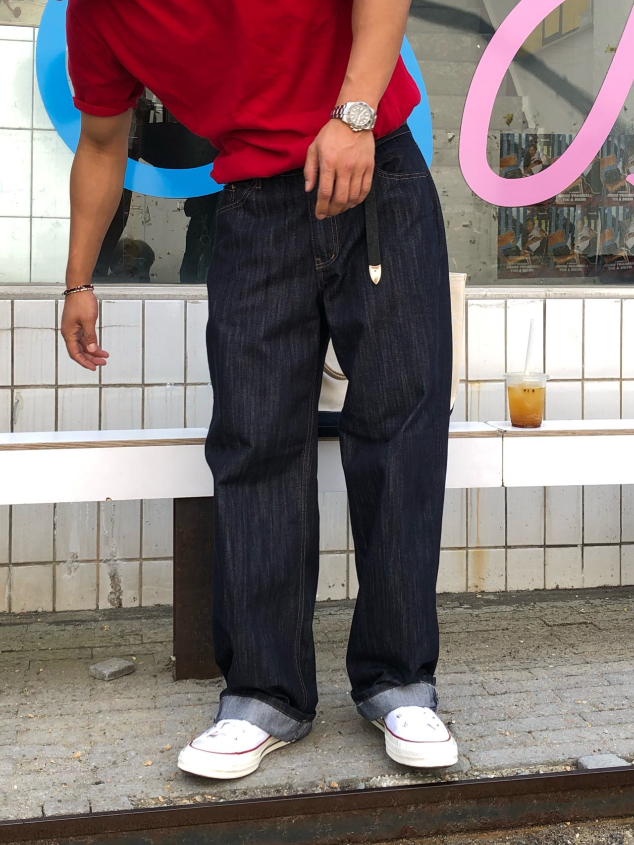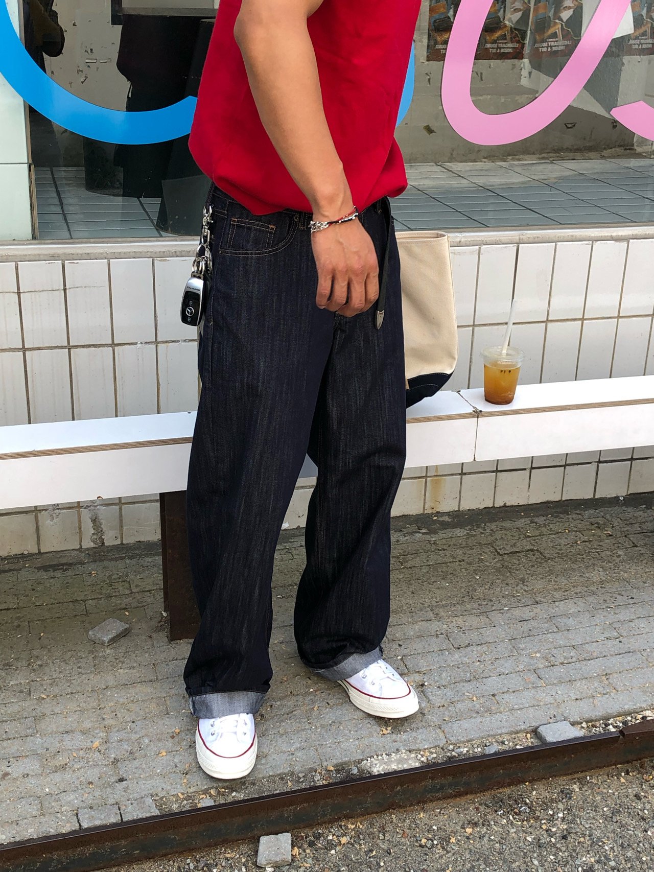 • 캐주얼 룩 : 생지 특유의 선명한 컬러와 긴 기장감이 포인트가 되어, 심플한 스타일에도 세련된 무드를 더해줍니다.