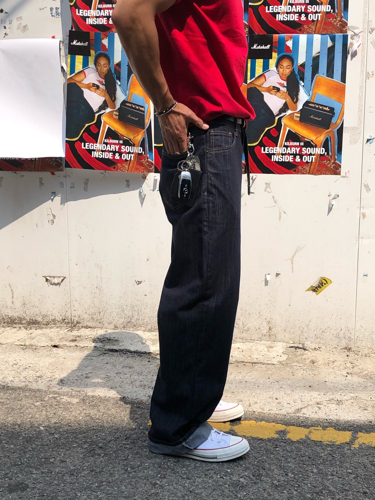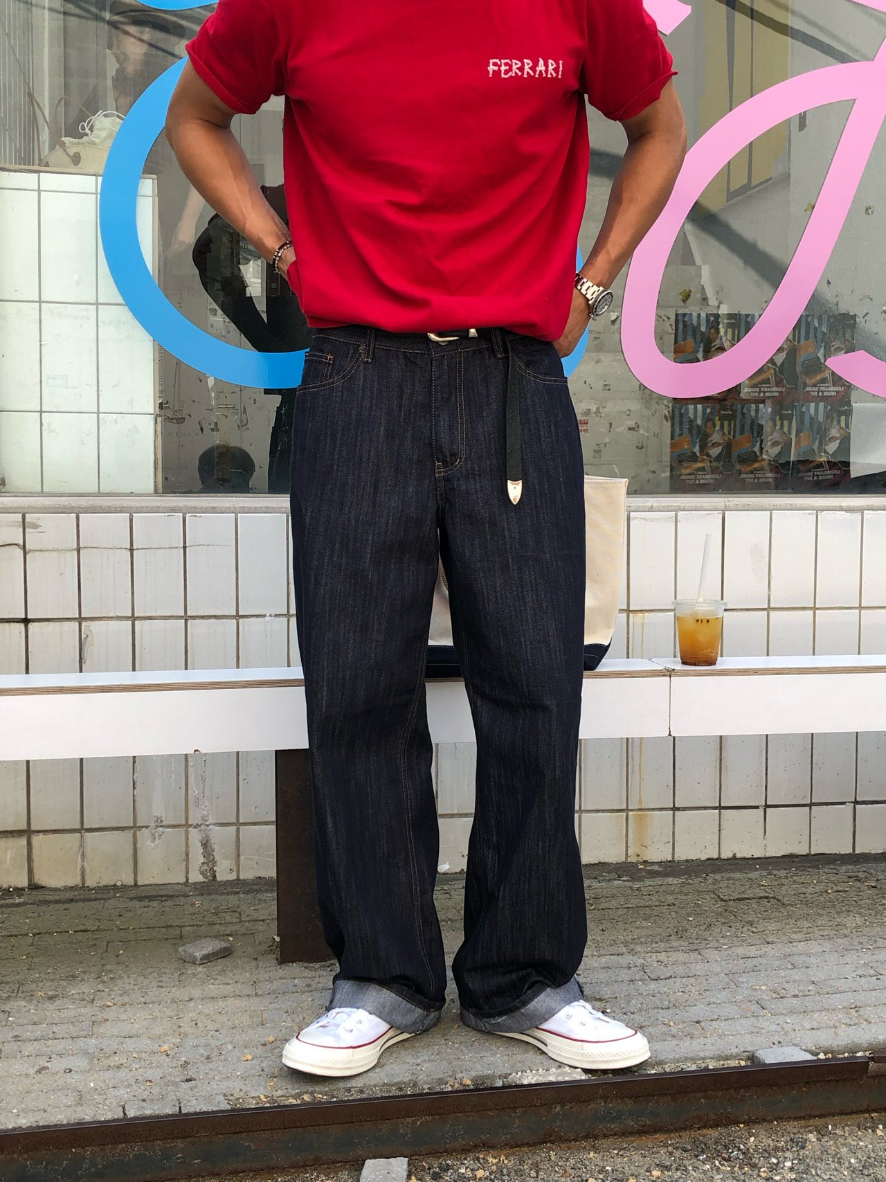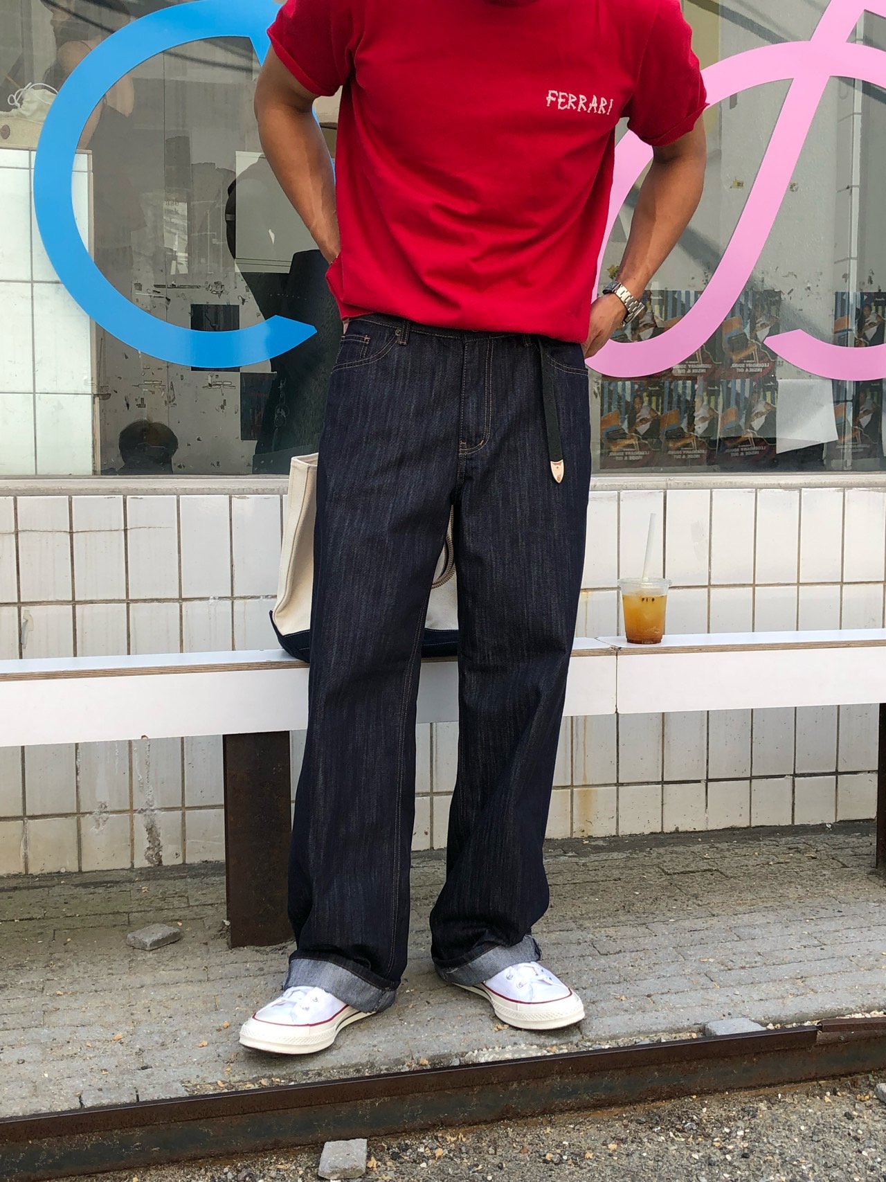 • 캐주얼 룩 : 생지 특유의 선명한 컬러와 긴 기장감이 포인트가 되어, 심플한 스타일에도 세련된 무드를 더해줍니다.