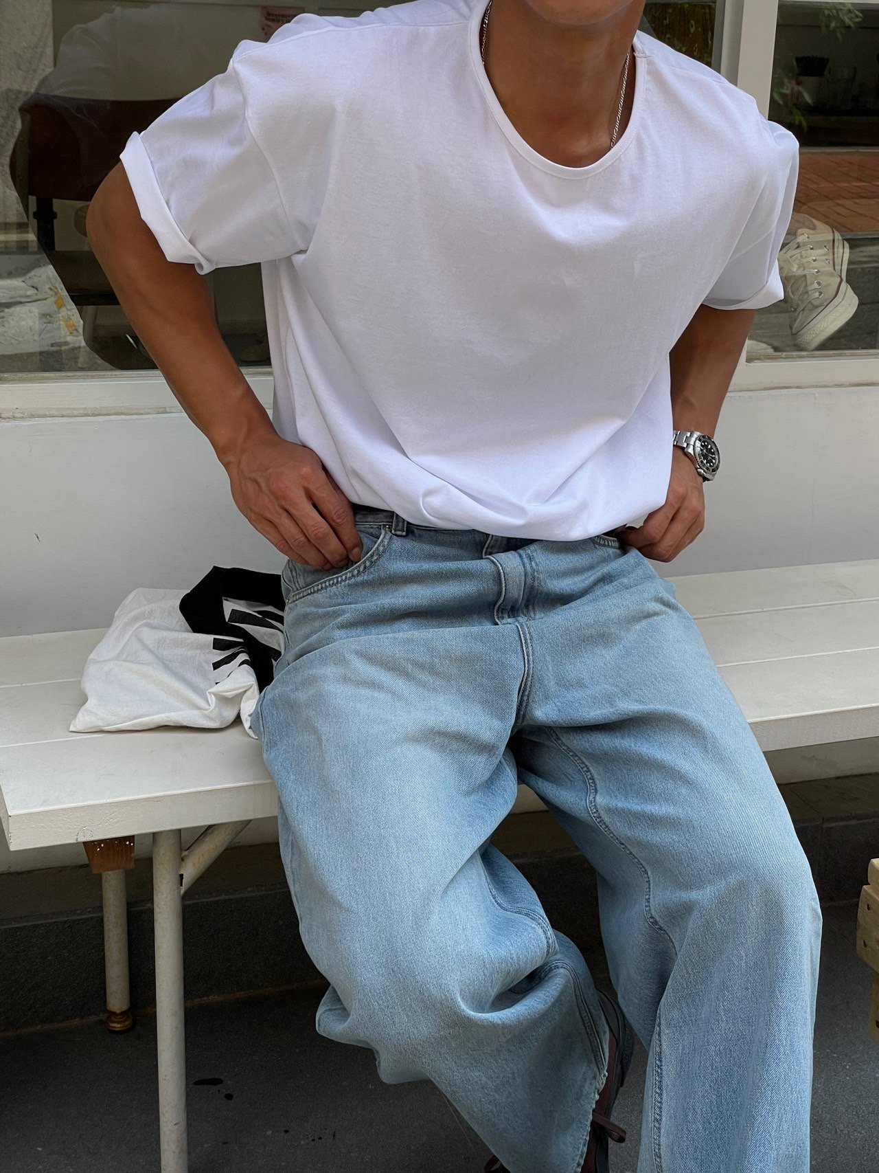 • 캐주얼 룩 : 셔츠나 아우터와 레이어드해 입으면 네크라인이 포인트가 되어 스타일링을 돋보이게 합니다.